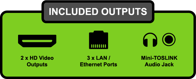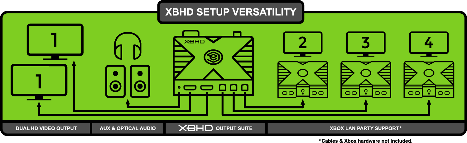 When connected to the original Xbox, the XBHD translates the component video signal into HD laglessly, outputting at 480i, 480p, 720p and even 1080i. This video signal is also accessible via two separate HD outputs allowing for dual streaming video for greater setup possibilities. The XBHD also simplifies LAN party connections by expanding the Xbox’s one available ethernet port to three, allowing four total systems to link seamlessly, no router required. Additionally, the XBHD provides a direct line to crisp audio through its 3.5mm MiniTOSLINK jack.