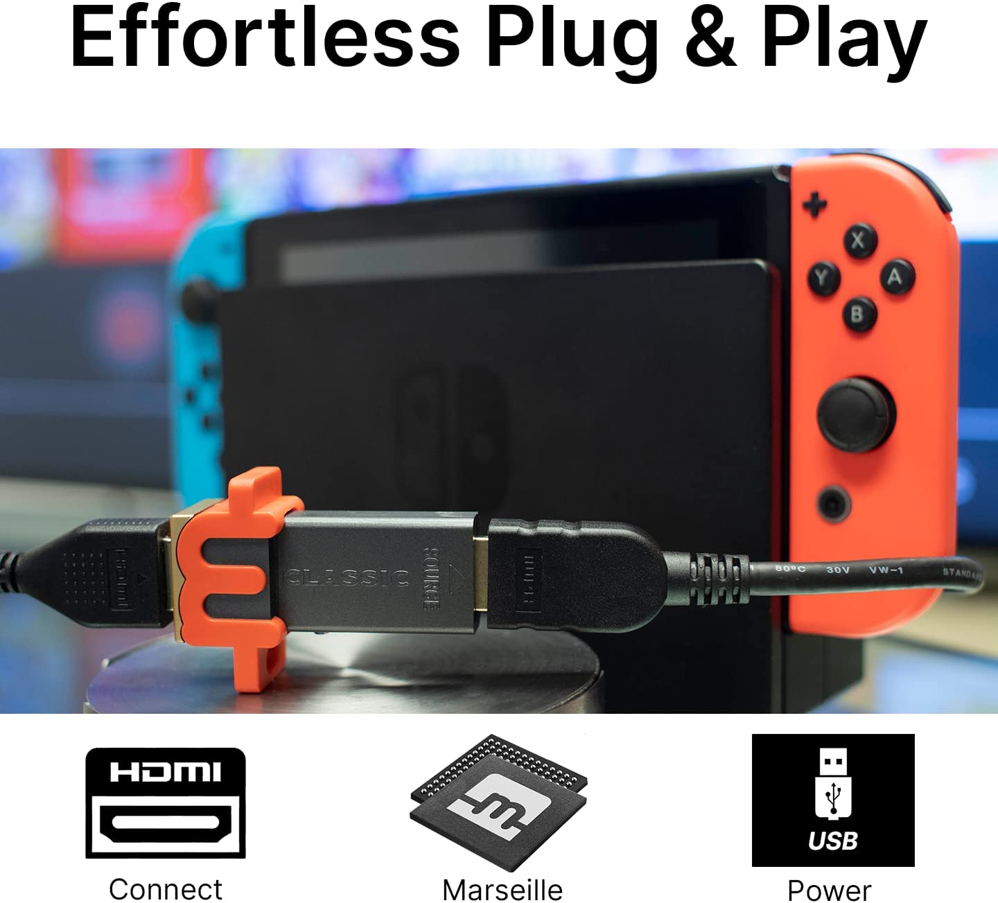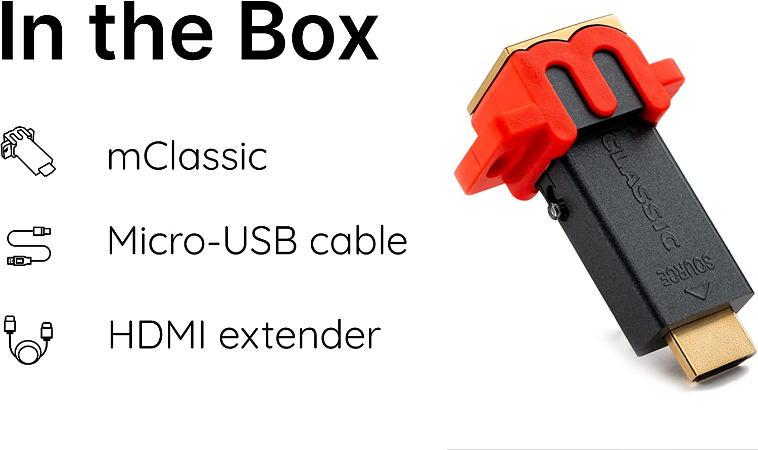 HOW IT WORKS: Insert mClassic into the HDMI port on your game console, dock, Roku or Apple TV and connect the other end to your TV or monitor with an HDMI cable and watch the magic happen! Includes mClassic, Micro-USB cable and HDMI extension cable.